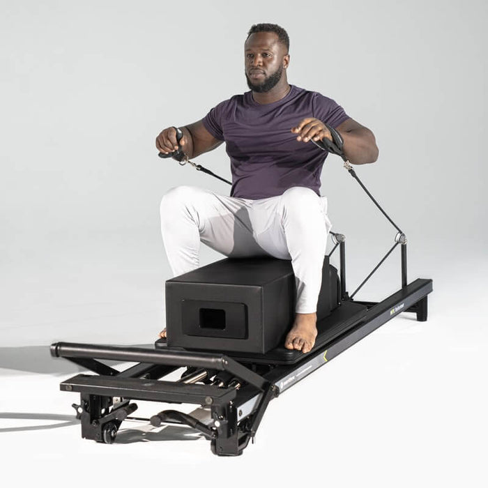 - Packaged with essential accessories including a Padded Platform Extender, Reformer Box with Footstrap and Metal Roll-Up Pole