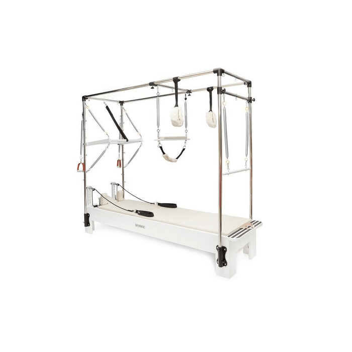 The Sportline Superior Cadillac-Reformer Trapeze Table is an amazing apparatus that will help you explore your fitness and rehabilitation needs. Enhance your routine and Pilates experience, or guide clients through exercises with this impressive piece of equipment. It’s clean white structure and chrome accents create a glossy, chic look that will fit wonderfully into your space.The durable hornbeam wood base will support you and the Reformer platform is designed to silence your movement. This bundle also includes a Jumpboard and Sitting Box offering even more value and exercise possibilities to this excellent deal!