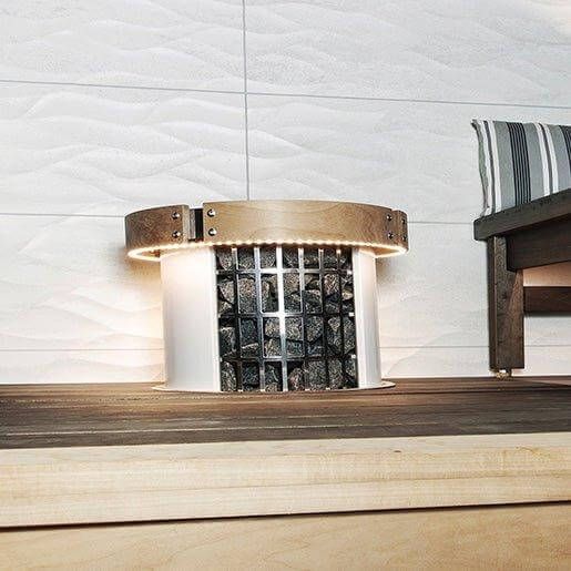 The Harvia safety railing is a good way to increase bathing safety around the Harvia Cilindro sauna heater. The safety railings consist of four wooden arches attached to each other and the sauna heater with stainless steel mounts. Made of heat-treated aspen, the railings add a stylish and pleasant touch to the decoration scheme of the sauna.  The LED lighting adds a decorative element that turns the sauna into a showpiece.  The beautiful railings are crowned by internal LED lights that accentuate the fracture surfaces of the sauna stones, making throwing water on the stones a sight to behold.