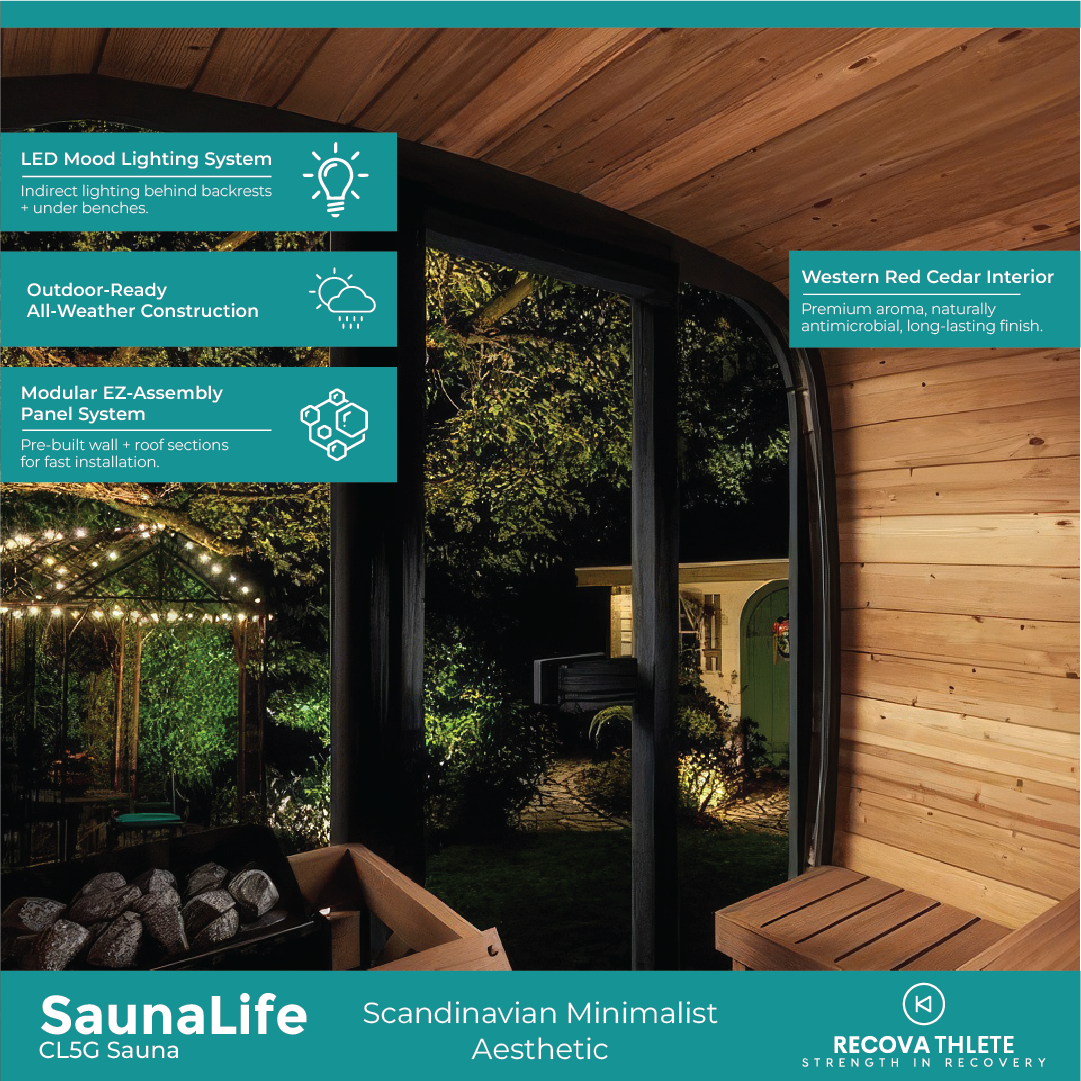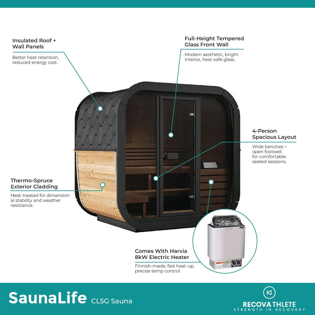 The SaunaLife CL5G 4-Person Cube-Series Outdoor Sauna Kit blends modern Scandinavian craftsmanship with functional elegance. Its full-glass front, ergonomic Thermo-Aspen benches, and durable Thermo-Spruce construction transform your backyard into a daily sanctuary for warmth, clarity, and connection.